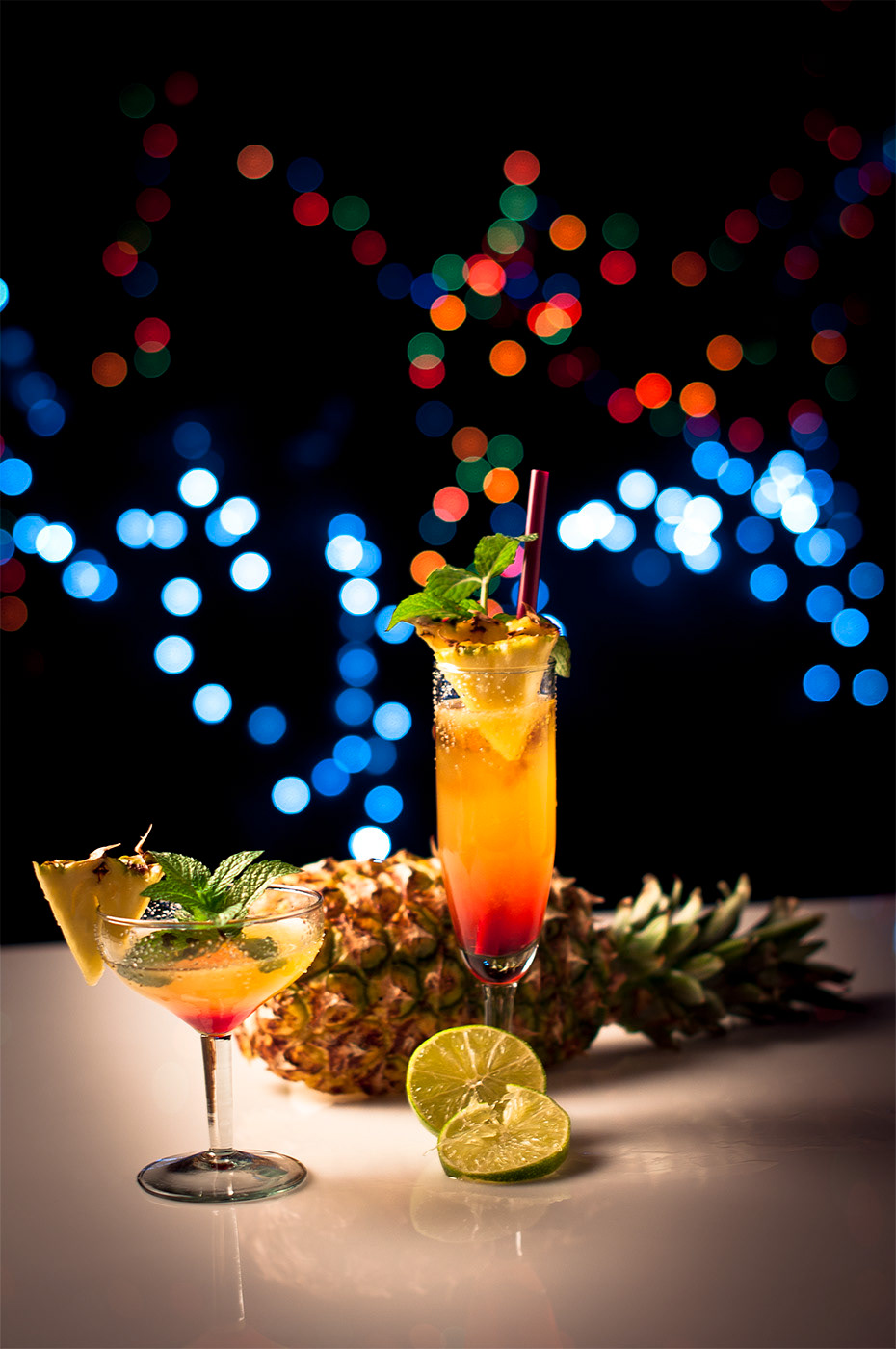 Exploración de iluminación y reflexiones en vidrio y líquidos en estudio fotográfico para la clase de Fotografía de la Universidad Piloto de Colombia.